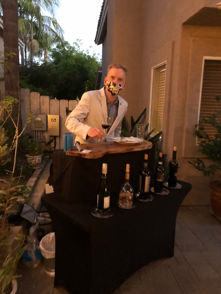 How do you hold a wine party during a pandemic? Easy. Hire KutaSomm. Sylvia celebrated her birthday this week in Carlsbad, complete with curated wines, education, and entertainment. Everyone gathered outside by the spectacular fireplace, wore masks (except when eating or drinking), and sat 6 feet apart. The Mediterranean theme was chosen because the birthday girl was planning a trip to Greece after the pandemic ends. The party enjoyed wines from coastal Mediterranean regions including Languedoc (France), Provence (France), Jumilla (Spain), Basilicata (Italy), and Peloponnese (Greece). Happy Birthday Sylvia.
