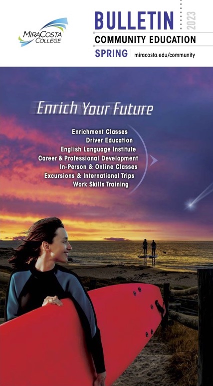 Winter/spring catalog Posted on November 30, 2022 by Dane Kuta Look for the Winter/Spring 2023 MiraCosta College Community Ed Bulletin coming in December. Turn immediately to page 21. Share this: Click to share on X (Opens in new window) X Click to share on Facebook (Opens in new window) Facebook Like Loading... Related Published by Dane Kuta View all posts by Dane Kuta