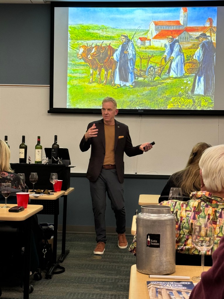 The History of Wine was a two-week wine appreciation course at MiraCosta College this fall semester. The material covered the history of wine was extensive, beginning in Georgia and China (9,000 to 7,000 BC), to the Egyptians, Phoenicians, Greeks, Romans, Benedictine monks, Middle Ages, the early modern era, and the last two decades. During the lecture, students enjoyed wine from grapes that date to the Roman era (Greco di Tufo), the Mission grape that Franciscan Padres planed at every California Mission, and modern day Merlot from the Stagecoach vineyard in Napa Valley. What a fantastic time!